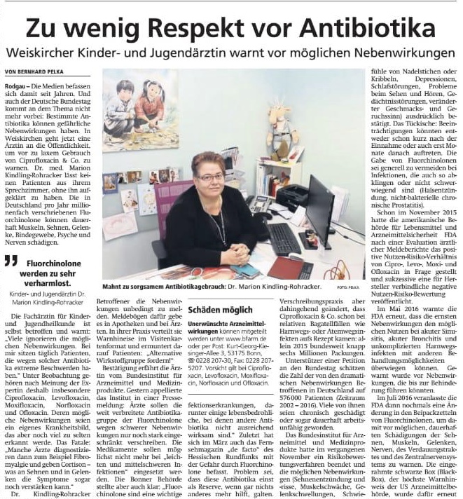 Allerdings das wichtigste das sich jeder Flox zwecks dem Beweis und der argumentativen Stütze dieser angeblich „seltenen Zufälle“ fragen sollte. Hat er / sie die eigenen Erfahrungen / Nebenwirkungen und seien es nur welche aus Verdacht gemeldet oder anderen Floxis dazu angeraten, beim melden geholfen? Das geht alles auch bequem ohne Arzt und sogar auch ohne Nachweis, allein die eigene Vermutung mit Einnahme und den aufgetretenen Symptomen reicht schon. In dem Zeitungsartikel steht auch die Adresse, an die man einfach vorzugsweise schriftlich mit Bitte um Bestätigung und Rückmeldung seinen Fall schildern sollte. Das machen leider viel zu wenige, weshalb zu lange nichts bzw. zu wenig passiert. Auch stetiges Nachmelden bei Persistenz der Probleme macht Sinn. Die Behörden und Hersteller sollen doch merken was uns passiert ist und es nicht mit dem Antibiotika üblichen Durchfall/ Kopfweh von einer Woche gleichsetzten und als sehr selten deklarieren.
