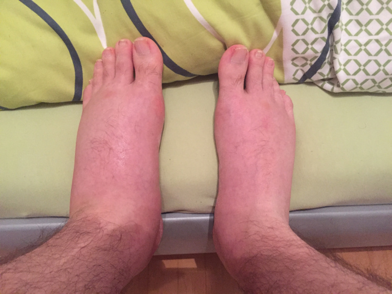 Flox-Füße, Ursache für Schwellung unbekannt, möglicherweise Gicht aufgrund von massivem Zellsterben oder Toxindepot wegen floxbedingtem Versagen der Entgiftungsenzyme, eine Gewebeanalyse wäre sicherlich interessant gewesen: