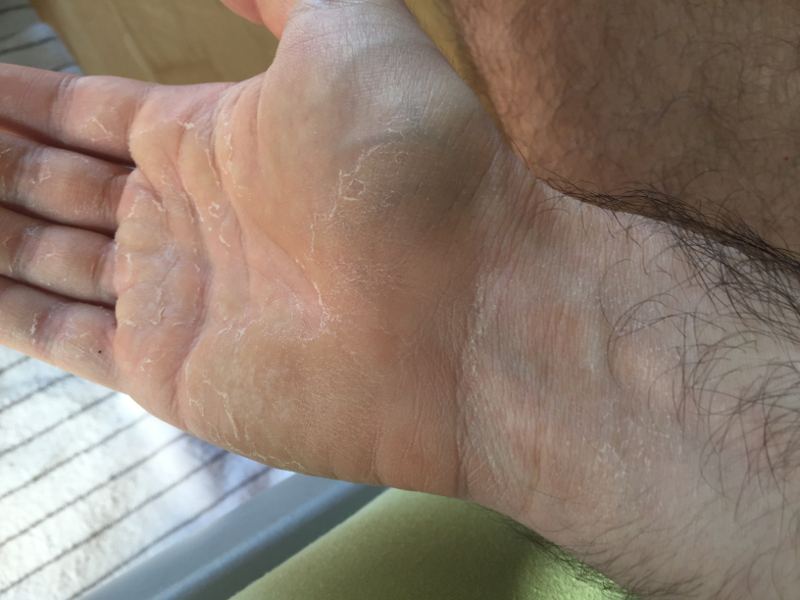 Hier sieht man Hautablösungen an der rechten Hand (15.09.2018)