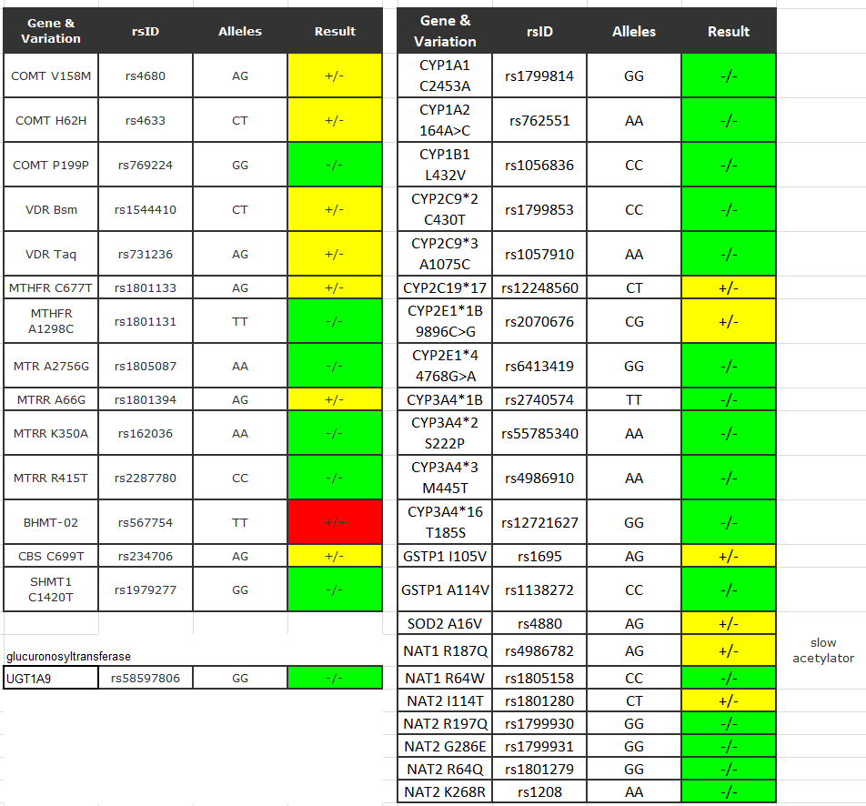 An Hand des verlinkten Bildes, was bedeutet das rote Feld bei BHMT-02 mit dem +/+? Für mich ist das ein Gewirr von Zahlen und Buchstaben, mit dem Resultat grün, gelb, rot und + bzw. - Zeichen. Einmal steht hinter den gelben Markierungen "slow acetylator". Das bedeutet, glaube ich, dass die Leber weniger schnell entgiftet. Aber auf welche Stoffe das bezogen ist, weiß ich trotzdem nicht.