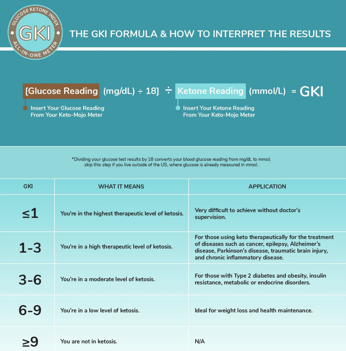 Ein GKI von unter 3 wäre somit die therapeutische Ketose, 3-6 eine moderate u. 6-9 ein ketoadaptierter Zustand:
