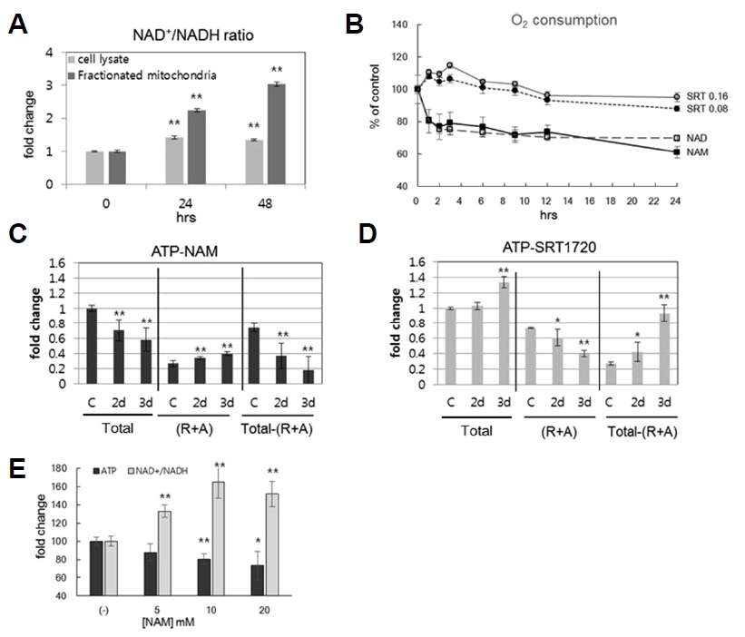 Resveratrol induziert ebenfalls die Mitophagie:To determine the level of involvement of SIRT1 activation, we checked the effects of treating cells with resveratrol or SRT172, activators of SIRT1, at doses frequently cited in the literature. As has been reported previously (Jang et al., 2012), treatment of these chemicals caused decreases in mitochondria content (Figs. 3A and 3B). In fact, they induced large decreases in mitochondrial content, causing nearly 40% reductions; this possibly suggests that it activates SIRT1-mediated mitophagy to levels that are higher than those achieved by NAM