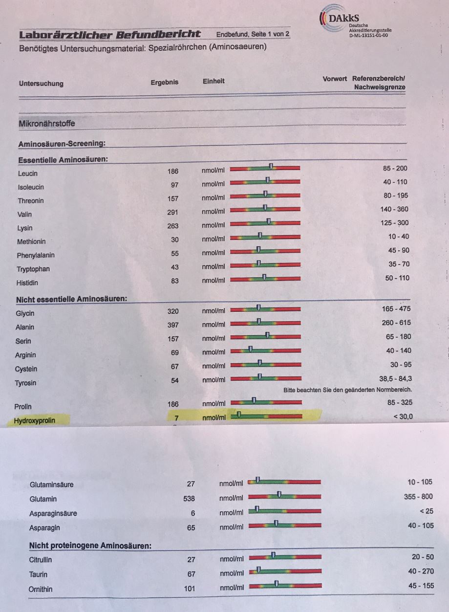 Seit einigen Tagen hat Ganzimmun in sein „Aminosäureprofil Entgiftung“ die Aminosäure Hydroxyprolin aufgenommen s. Screen