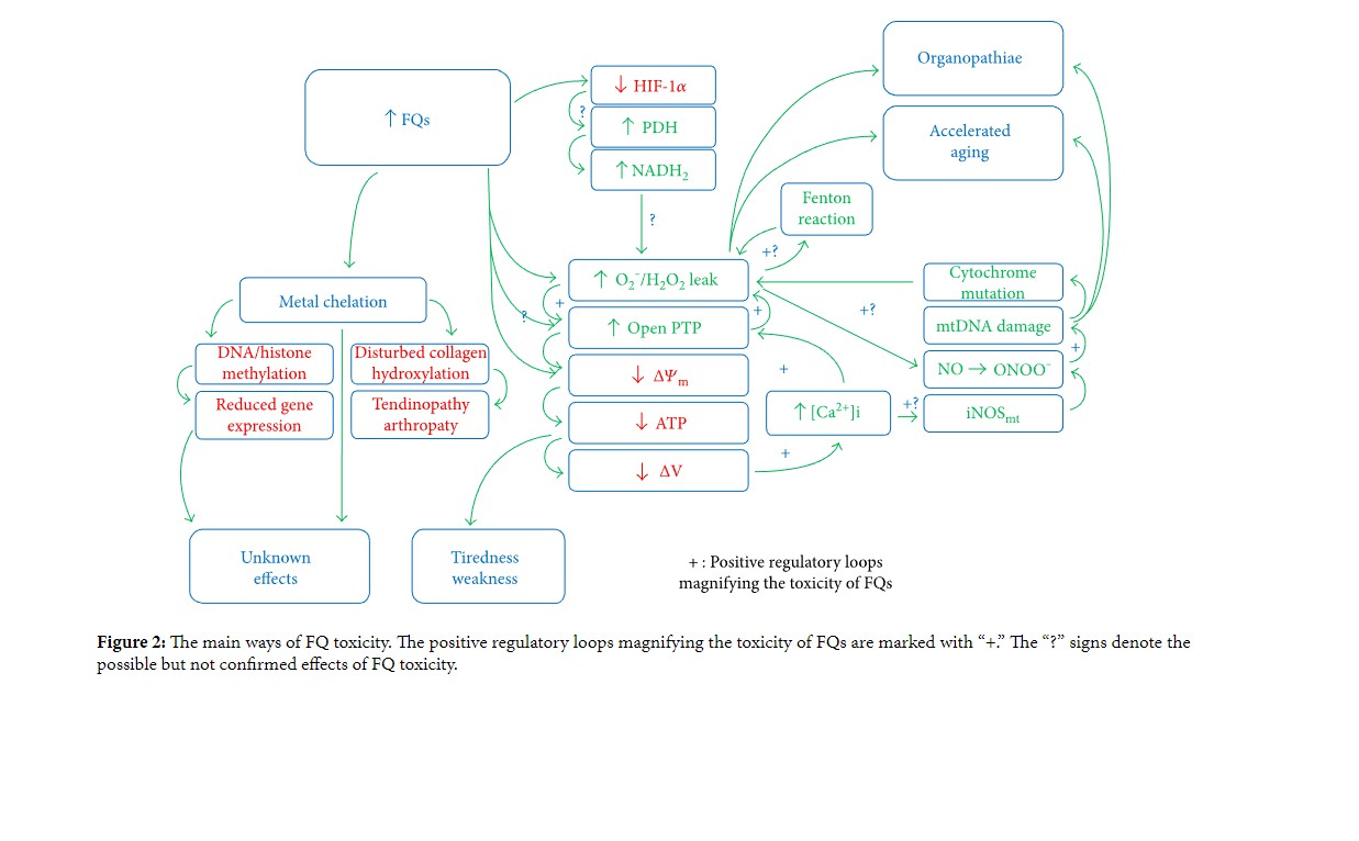1. FQ's binden Mineralien wie Magnesium, Kupfer, Zink, Mangan und Selen aber auch Proteine. Bei einem Mangel an extrazellulären Mineralien bindet es sich an die intrazellulären Mineralien der Körperzellen (bevorzugt Sehnen- und Nervenzellen) und schädigt somit die Mitochondrien welche als Kraftwerke der Zellen fungieren. Schwer geschädigte Mitochondrien setzen Radikale frei, der sog. oxidative Stresspegel erhöht sich während gleichzeitig der Pegel der natürlichen Antioxidantien wie Glutathion sowie SOD sinkt.