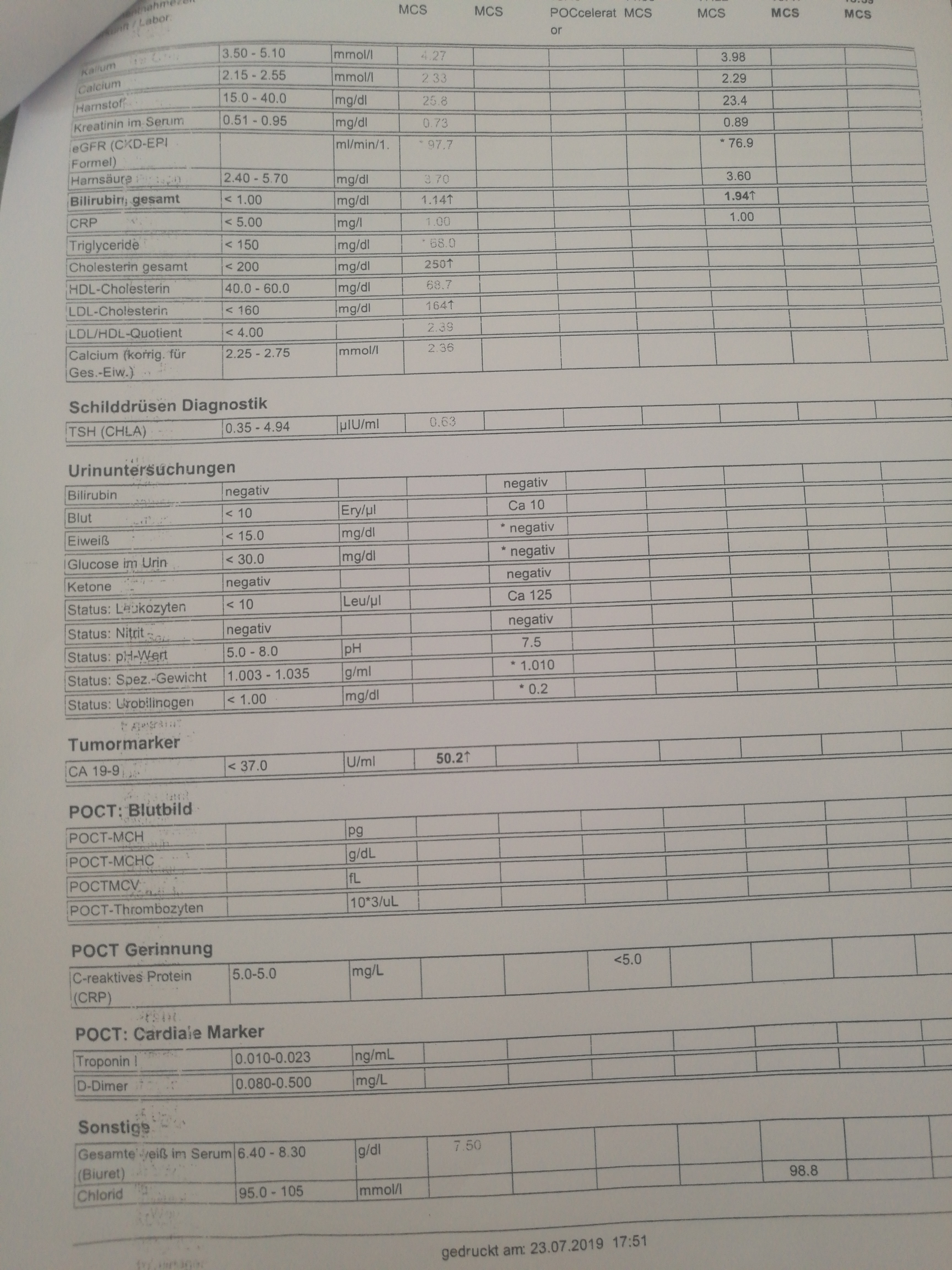 ausfällig ist zunächst der Glucosewert am 21.7.2019 = 57,0 mg/dl (Norm 70-100 mg/dl).