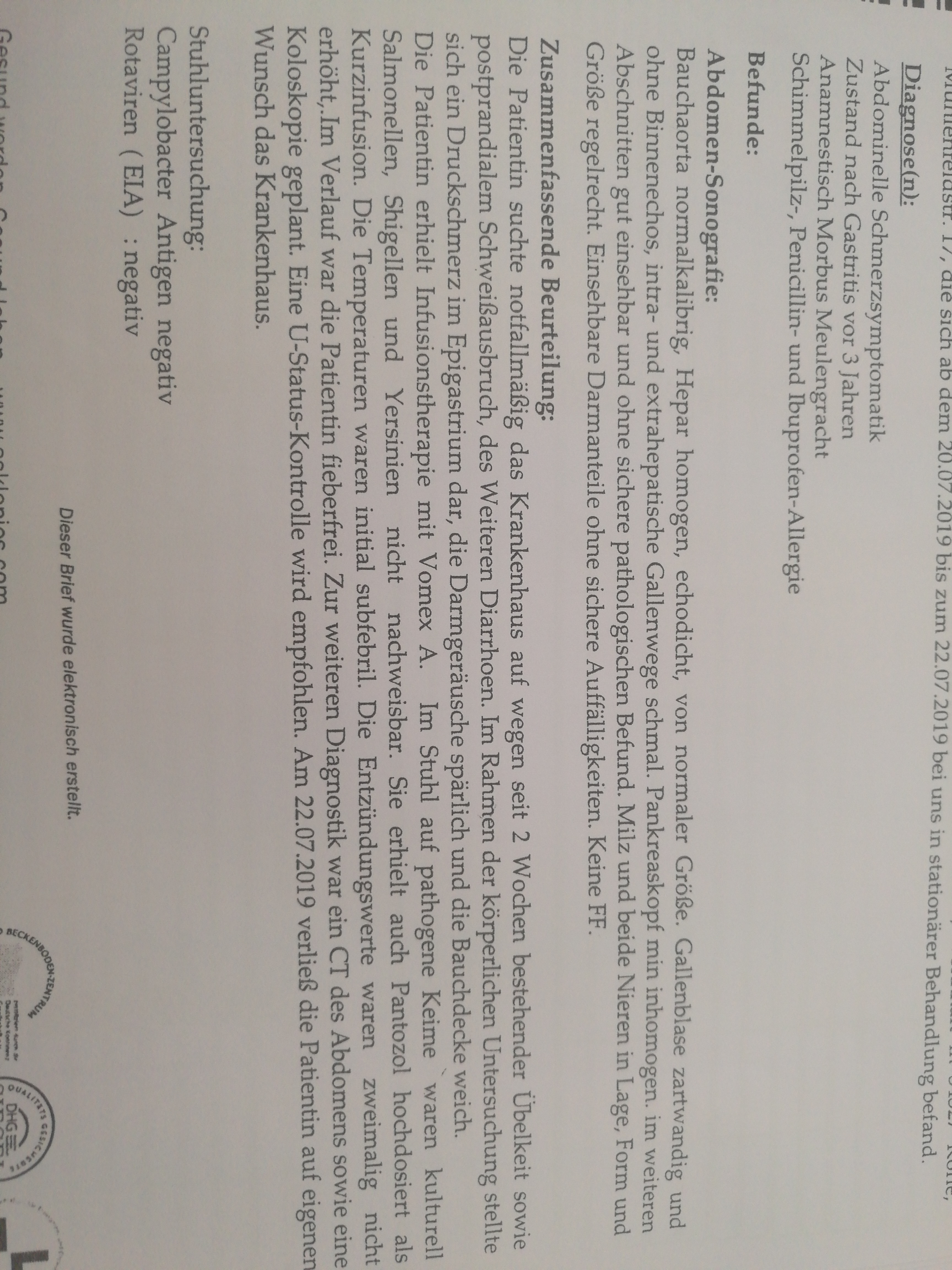 Eine Überweisung ct abdomen hab ich Termin am 5.August..erst..und gleich nochmal Ultraschall beim gastrologen. Bin nur nicht sicher was für ein Ultraschall, Endoskopie macht er auch.
