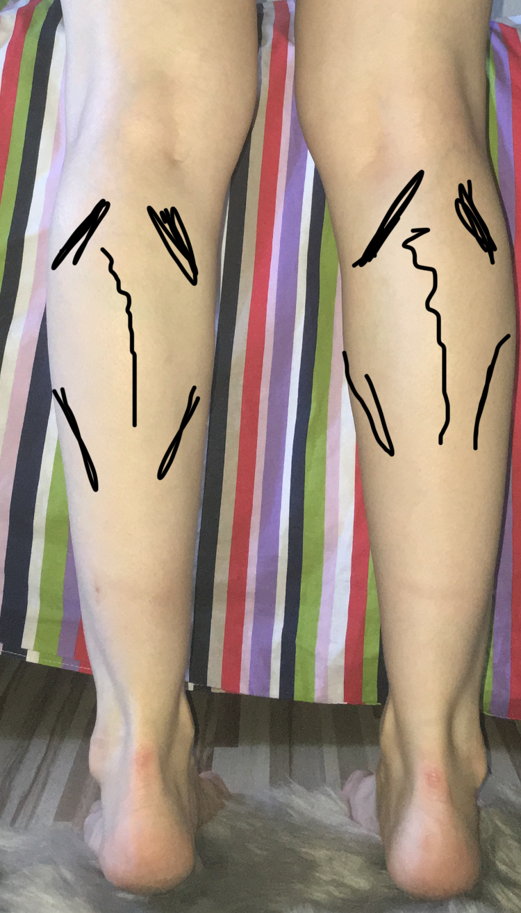 ich habe mir gedacht ich stelle mal ein Bild von meinen Waden hier rein ich habe die genauen stellen wo ich starke Probleme habe eingezeichnet.