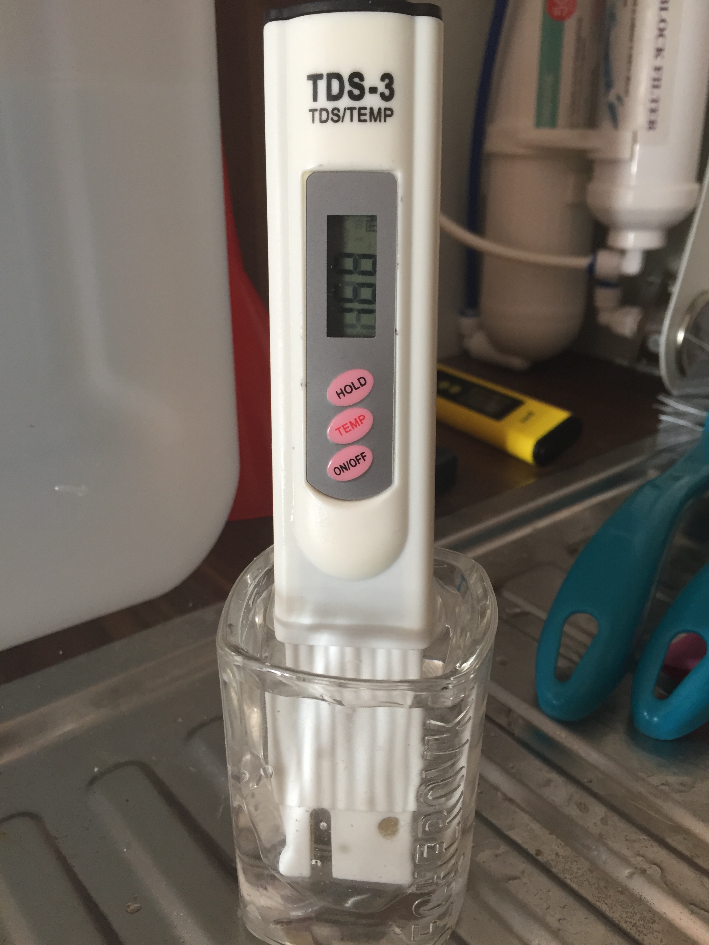 Das TDS-Meter misst 168 ppm bei ungefiltertem Leitungswasser und 10 ppm nach der Membran.