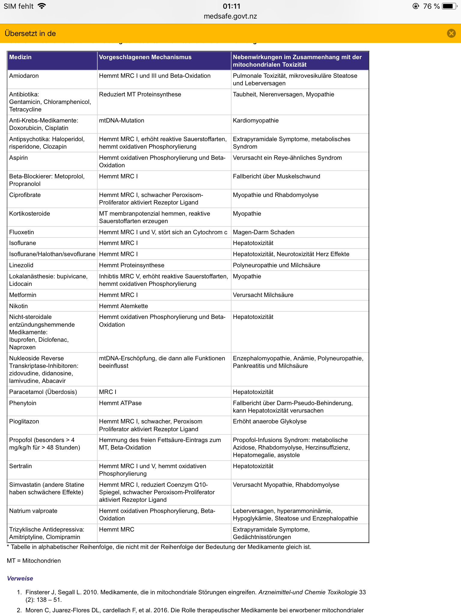 Neuseelands Gesundheitsministerium veröffentlicht eine Liste einiger Medikamente, die man bei mitoch. Funktionsstörung vermeiden sollte.