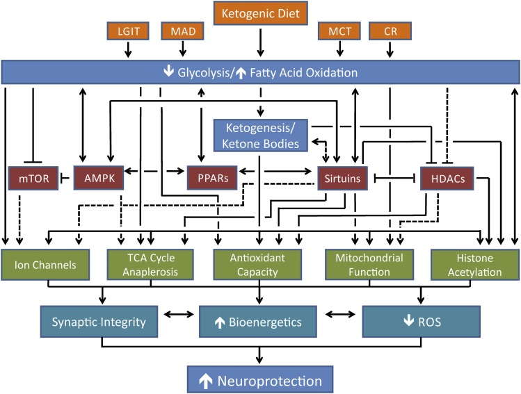 (↓Glykolyse) (↑Fettsäure Oxidation) (↓ROS) Mechanismen für die neuroprotektiven Wirkungen der KD und ihrer Varianten. Die diätetischen Eingriffe sind in orange dargestellt; Die Stoffwechseleffekte der Diäten sind blau dargestellt. Die Energieerfassungspfade, die die Auswirkungen der Ernährungsumstellung vermitteln können, sind rot dargestellt. Die zellulären Wirkungen, die sich aus den Diäten und / oder den Energieerfassungswegen ergeben, sind grün dargestellt. Die breiten schützenden Wirkungen der Diäten und die resultierenden zellulären Wirkungen sind in Cyan gezeigt. Durchgezogene schwarze Linien kennzeichnen in der Literatur nachgewiesene Verknüpfungen. Gestrichelte schwarze Linien stellen mögliche, aber noch unbewiesene Verknüpfungen dar. Weitere Details finden Sie im Text.