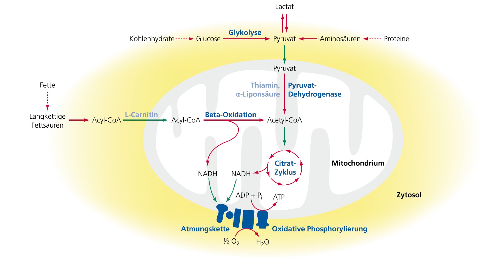 Das folgende Schema zeigt die beiden Energiepfade in das Mitochondrium, einmal den Weg der Fette und auf der anderen Seite der Weg der Kohlenhydrate und Aminosäuren (Proteine), bei der heutigen Ernährung ist der Pfad der Fettsäuren nahezu inaktiv, bei der ketogenen Ernährung dagegen läuft die Energiegewinnung größtenteils über diesen Pfad ab: