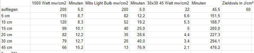 da ich gerne meine kompletten Beine damit bestrahlen möchte, bin ich dazu übergegangen ca 3 Minuten die Vorderseite und 3 Minuten die Rückseite der Beine zu bestrahlen auf 45cm Distanz, das hat auch den Vorteil, dass ich bei der größeren Distanz beide Beine gleichzeitig treffe. Komme damit auf ca 8j/cm² Strahlung für 3 Minuten, die bereits positive Wirkung bei mir hat und ich benötige nur 6 Minuten täglich.