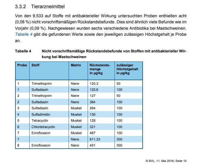 Hier wurden erstmals Rückstände von Fluorchinolonen gefunden, mit bis zu 60 µg/g, bei einem zulässigen Grenzwert von 100 µg/kg.