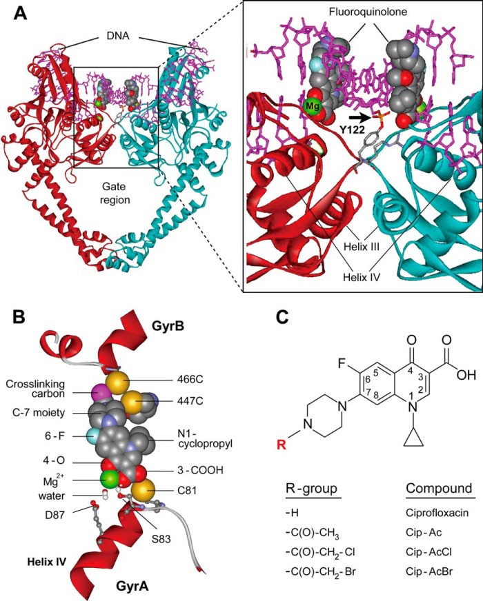 "DNA gyrase and topoisomerase IV control bacterial DNA topology by breaking DNA, passing duplex DNA through the break, and then resealing the break. This process is subject to reversible corruption by fluoroquinolones, antibacterials that form drug-enzyme-DNA complexes in which the DNA is broken. "